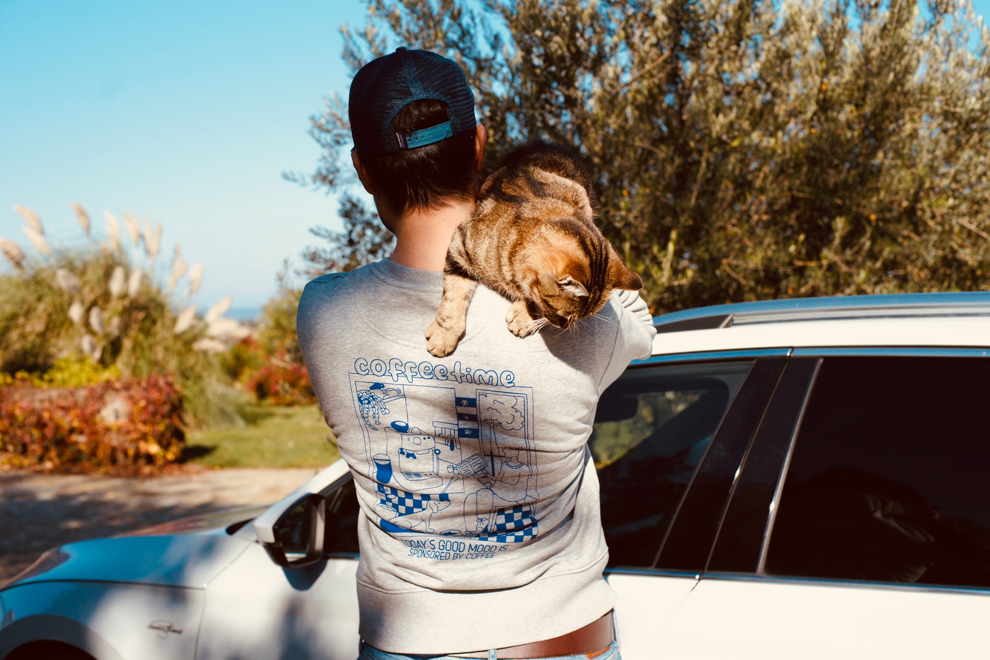 On the front, a minimalistic “Sip. Savor. Smile.” , and on the back, an illustration of your ideal day – coffee, peace, and a dog that understands you more than an alarm clock.
