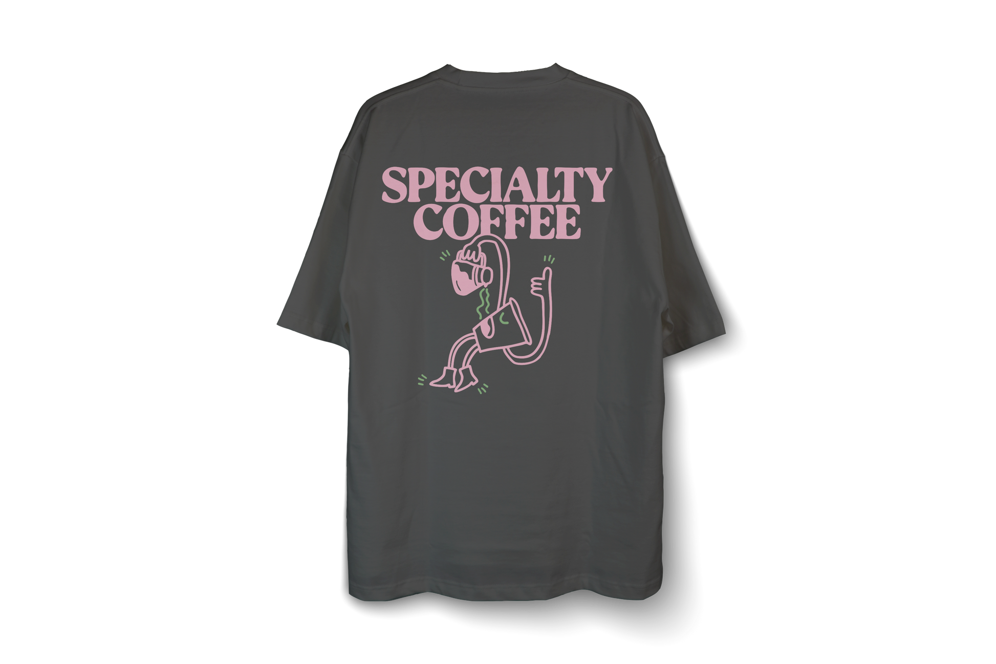 And on the back, you hit it straight – SPECIALTY COFFEE – with a pink print and an illustration that looks like it was drawn by a barista after his third flat white.