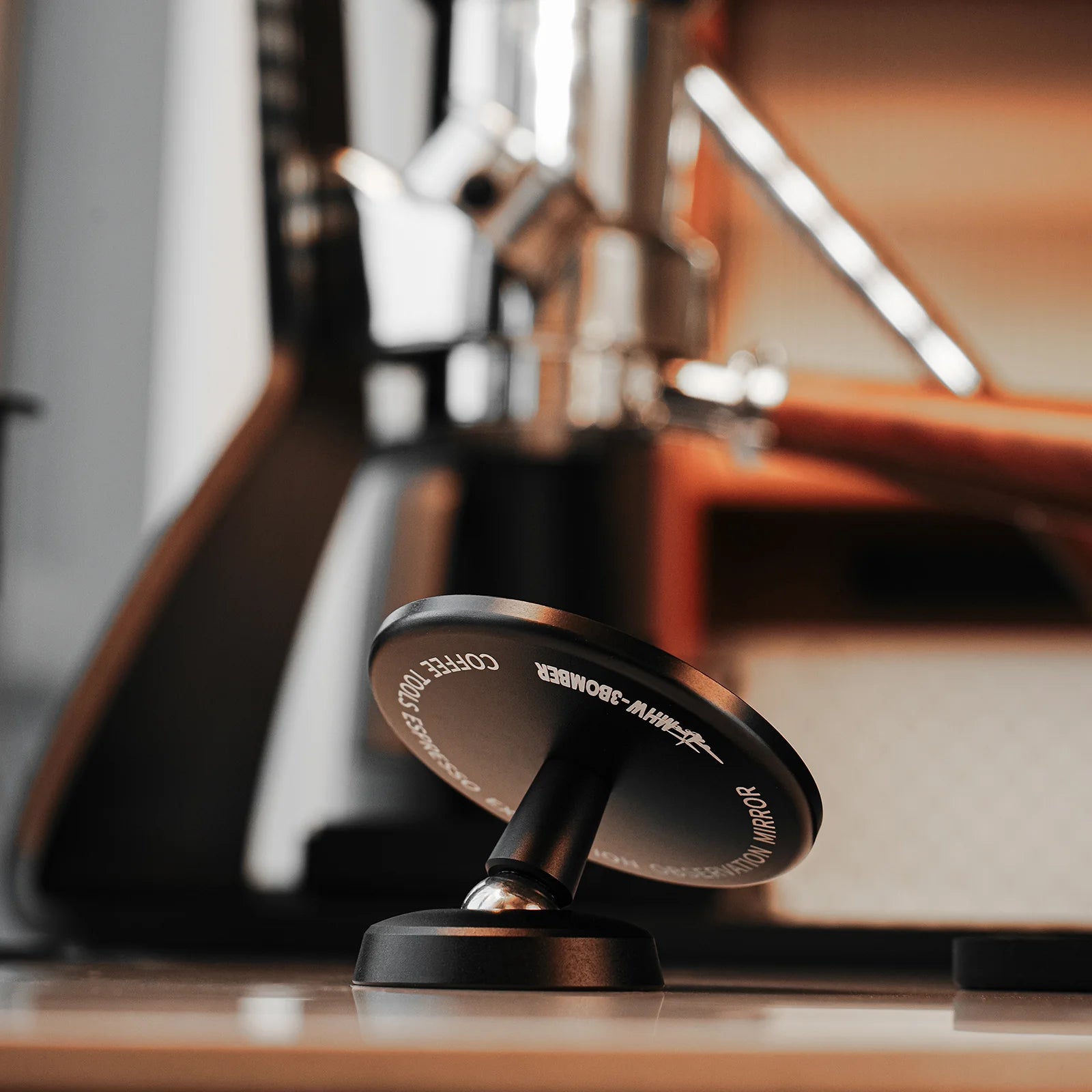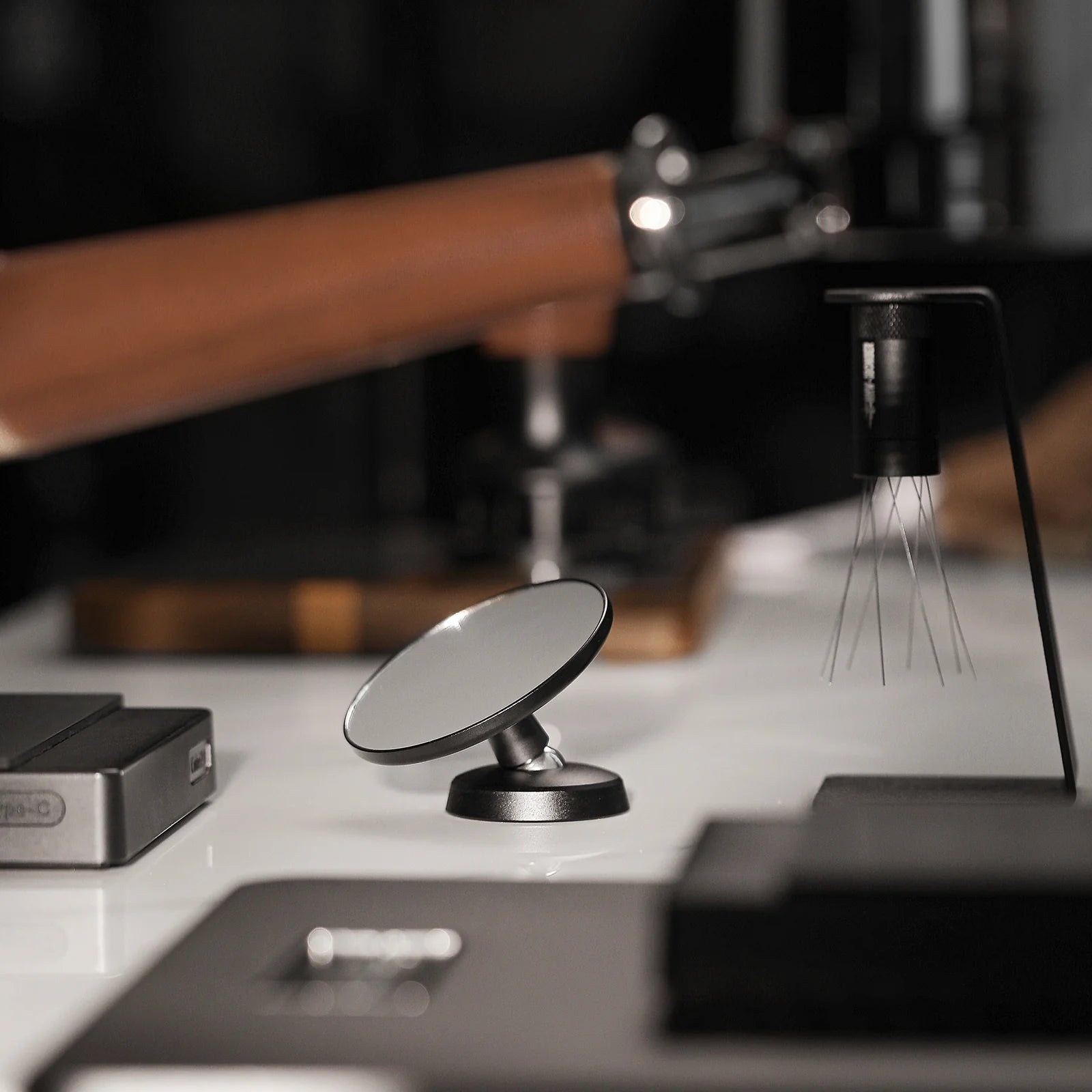 It is designed with functionality and aesthetics in mind. The magnetic base and 360-degree swivel joint allow you to perfectly adjust the viewing angle to your layout. The black housing (Black Mirror Edition) offers a minimalist and modern look that goes with any espresso machine, while helping to instantly detect channeling and other irregularities in coffee preparation.