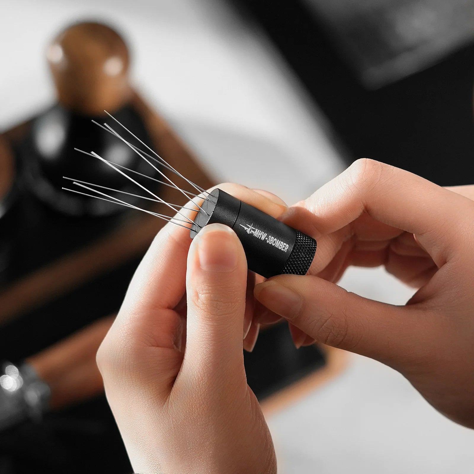 The tool is made from a combination of high-quality stainless steel and aluminum alloy, ensuring durability, corrosion resistance and a long service life even with regular use. The construction is stable, yet light and balanced enough for precise handling. The thin, evenly spaced needle attachments allow for effective breaking of static clumps and a more consistent distribution of coffee particles across the entire surface of the basket.