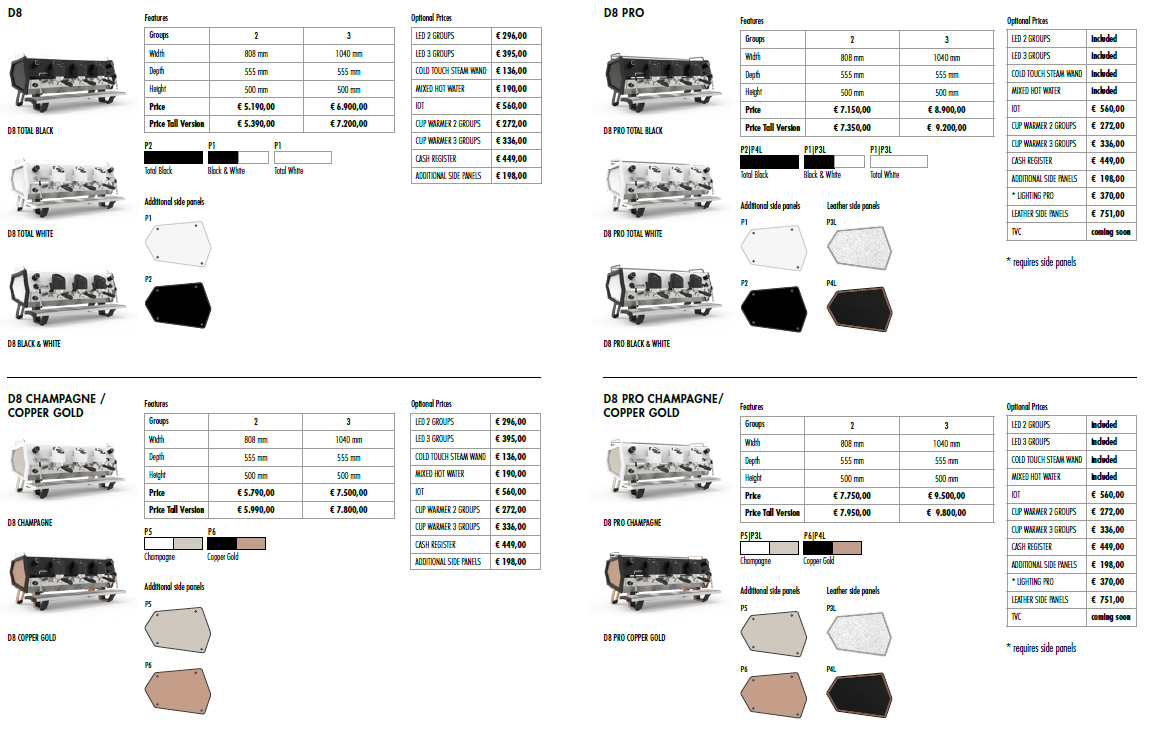 _Dodatki: IoT/aplikacija, jekleni grelnik skodelic, element kotla s povečano paro, blagajna, stranske plošče po meri, usnjene stranske plošče, osvetljene stranske plošče (zahteva stranske plošče po meri), sistem za samodejno penjenje (kmalu).